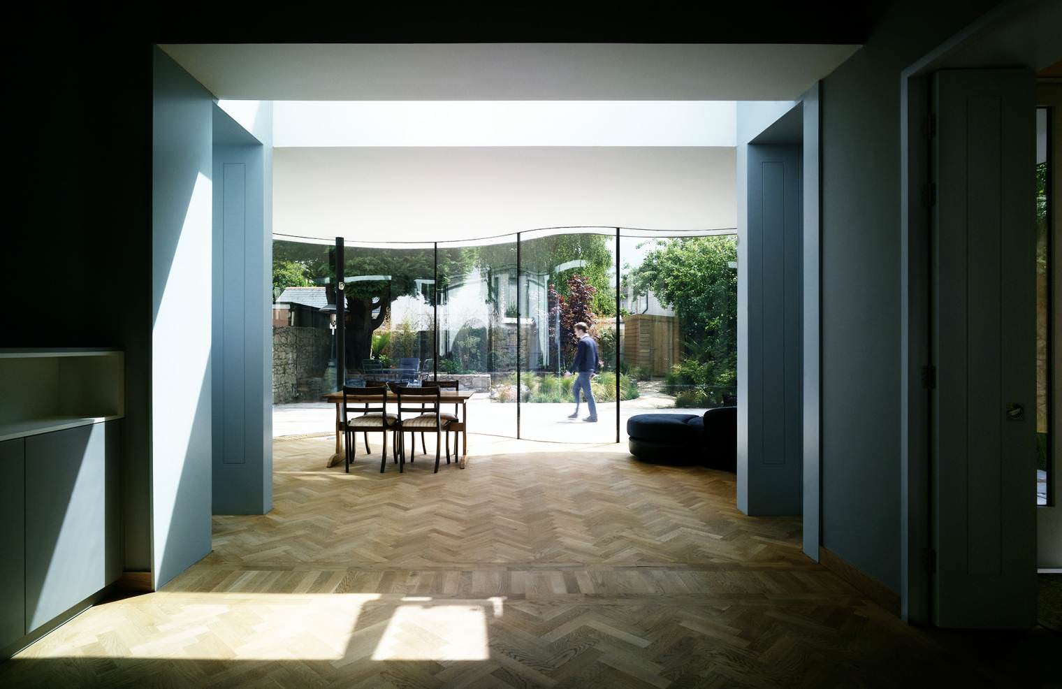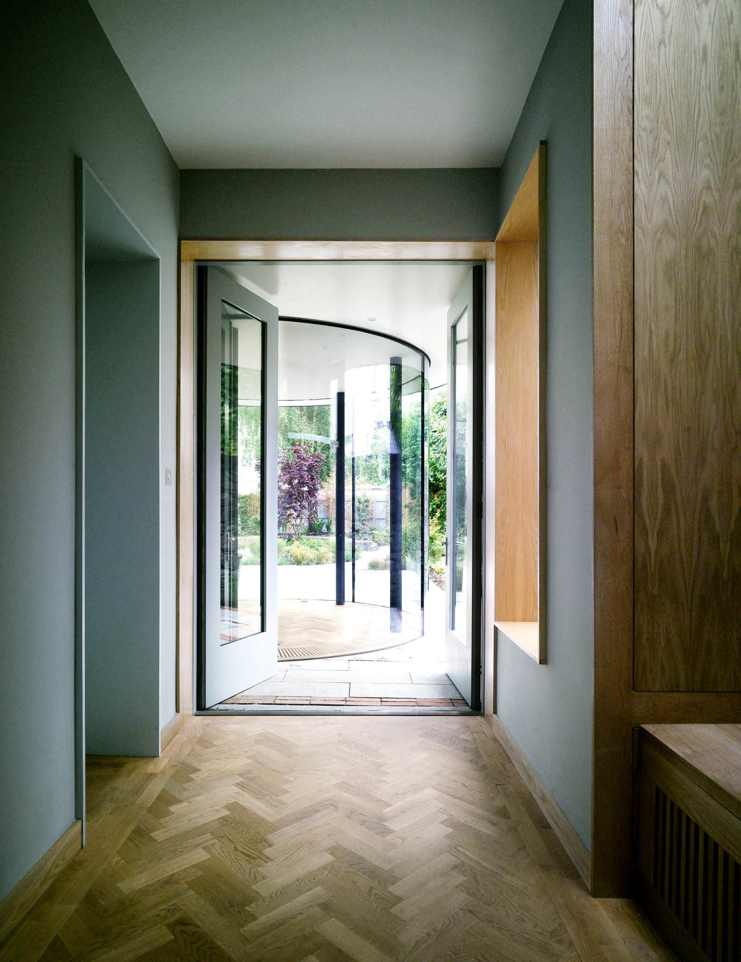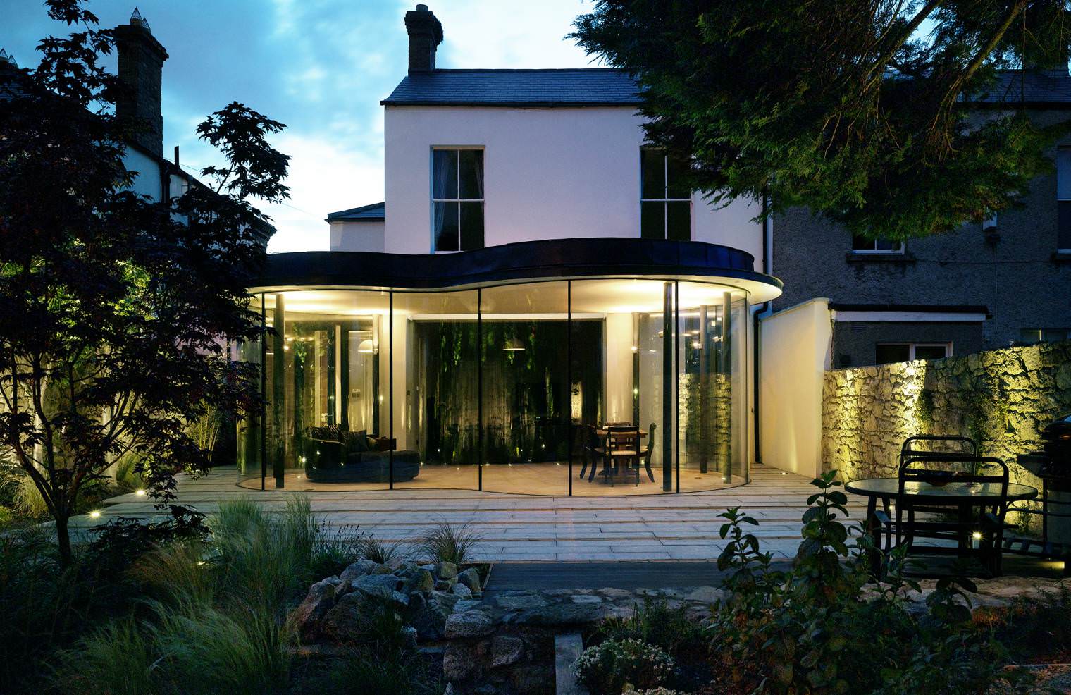This project involved the re-ordering of the ground floor plan, of a Victorian terraced house, a Protected Structure. The main reception room is relocated to the rear of the property and the introduction of an adjoining glass pavilion extends this space further towards the garden. The curvilinear form of new pavilion comprises bespoke floor to ceiling curved glass panels with slim steel columns supporting the roof. A new reading room is also introduced to connect the existing entrance hall to both the new central living space and the rear patio area. Status: Completed 2013. This project featured in a number of magazines, to view the articles visit our Publications here.