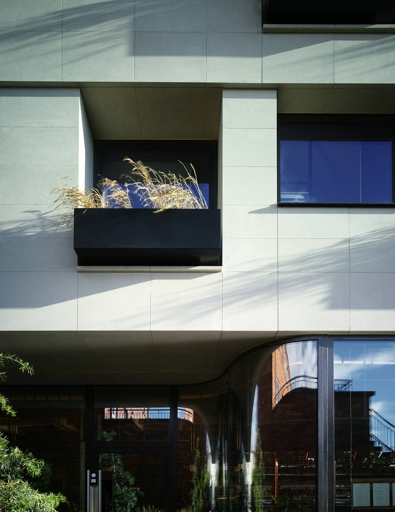West elevation with deep window reveals and projecting planter boxes to bedrooms